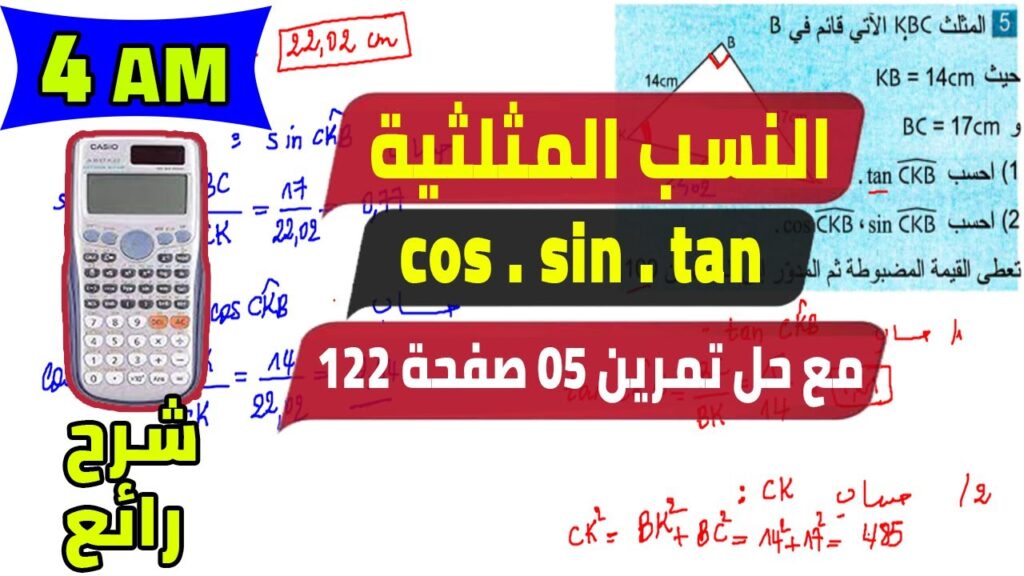 شرح النسب المثلثية بالتفصيل جيب تمام جيب وظل زاوية حادة كذلك استعمال الحاسبة في حساب نسب مثلثية وحساب أقياس زوايا للسنة الرابعة متوسط مع حل تمرين 05 صفحة 122 من الكتاب المدرسي
