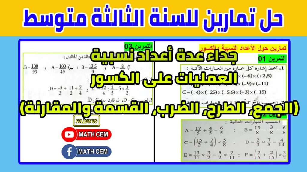 رياضيات السنة الثالثة متوسط سلسة تمارين حول جداء عدة أعداد نسبية والعمليات على الكسور جمع وطرح كسرين جداء كسرين وقسمة كسرين مقارنة كسرين تمارين للمقطع الاول رياضيات ثالثة متوسط لتحميل التمارين الرابط التالي: