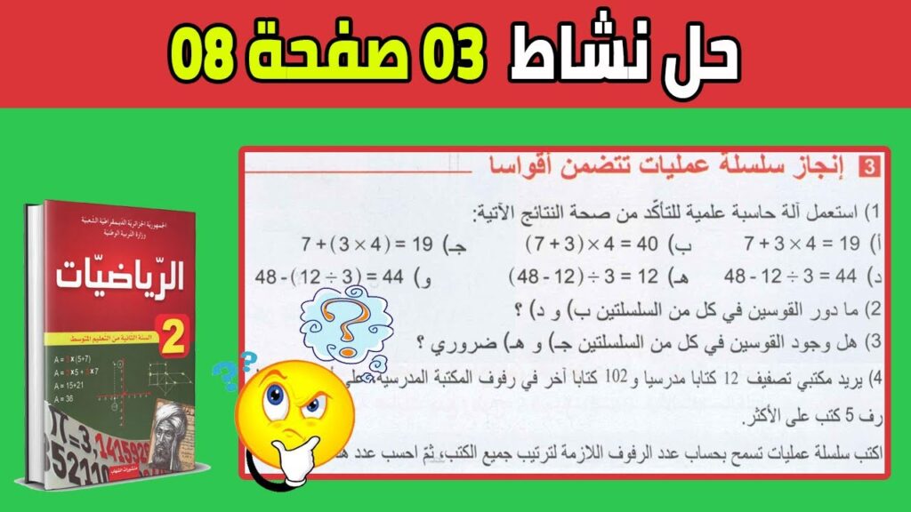 في هذا الفيديو سنقوم بحل نشاط 3 صفحة 8 من الكتاب المدرسي رياضيات السنة الثانية متوسط المقطع الأول العمليات على الأعداد الطبيعية أولوية العمليات